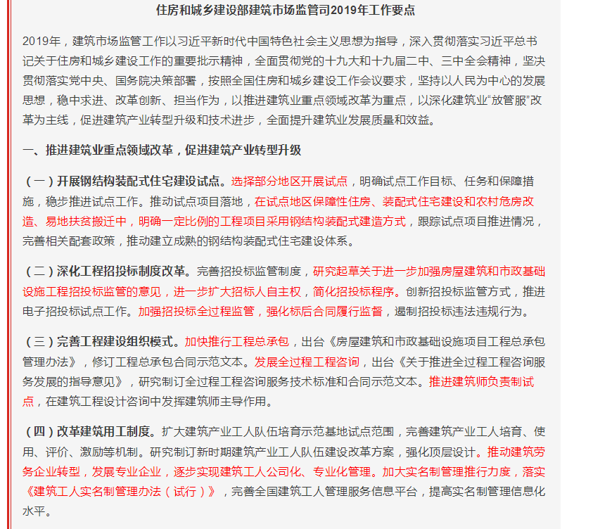 剛剛,《住房和城鄉(xiāng)建設(shè)部建筑市場(chǎng)監(jiān)管司2019年工作要點(diǎn)》正式印發(fā)。2019年建筑業(yè)重點(diǎn)領(lǐng)域改革力度,可謂前所未有!